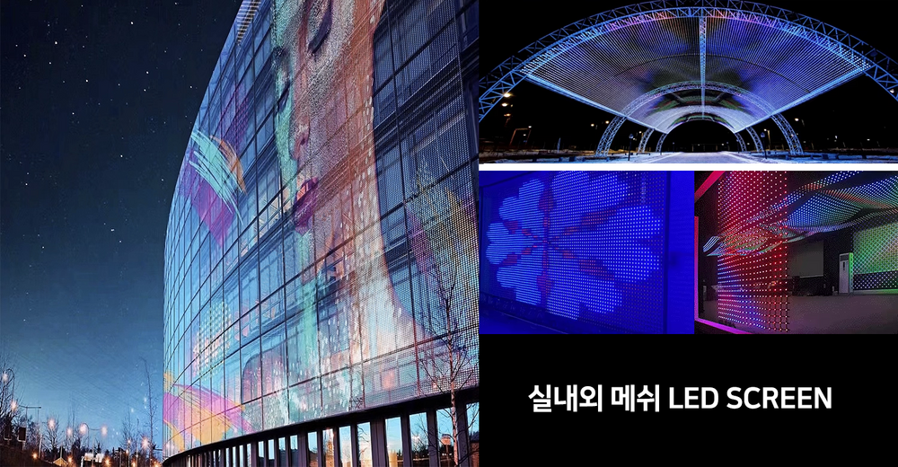 피치 간격 31mm ~100mm 메쉬 LED스크린은 백화점및 상업시설의 실내외 이벤트또는 크리스마스등의 특별한날에 빛의 예술성을 표현할 수 있다.